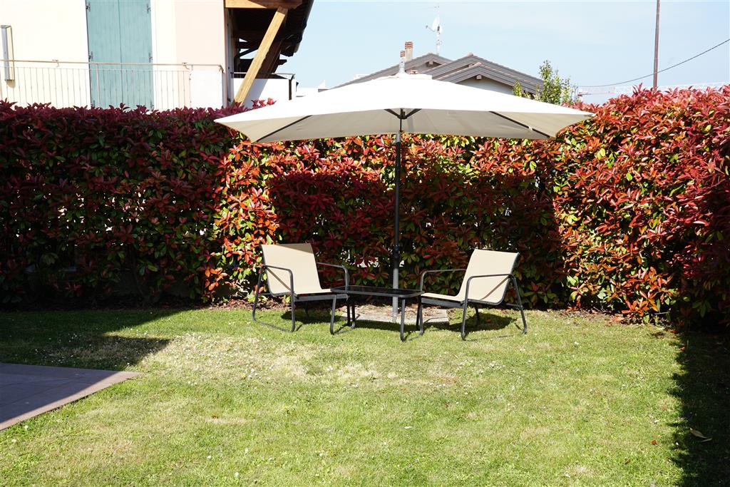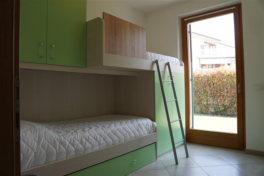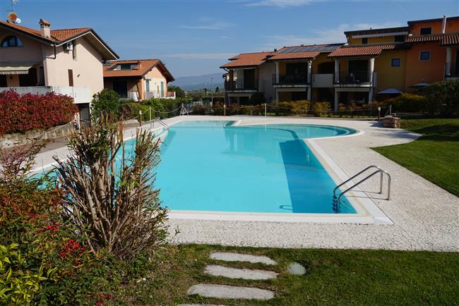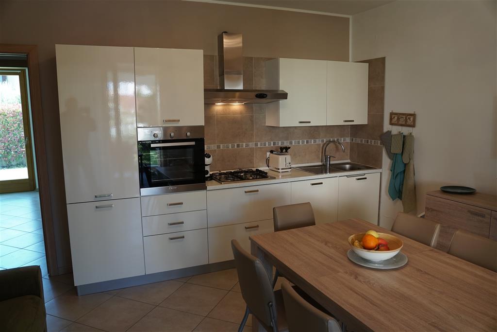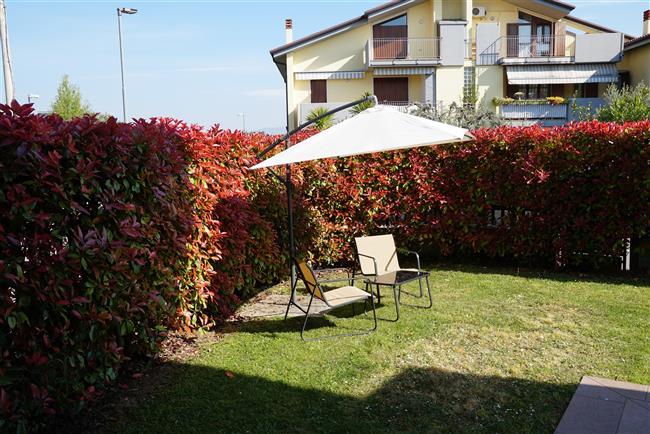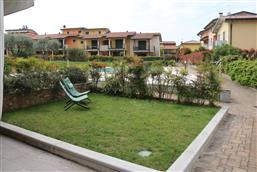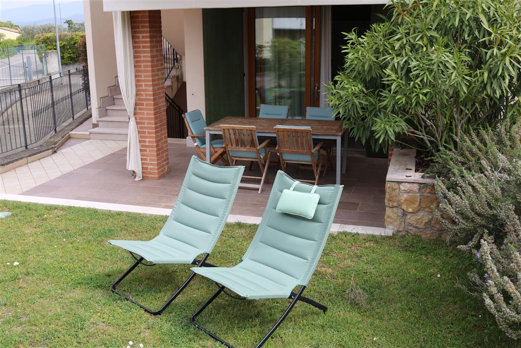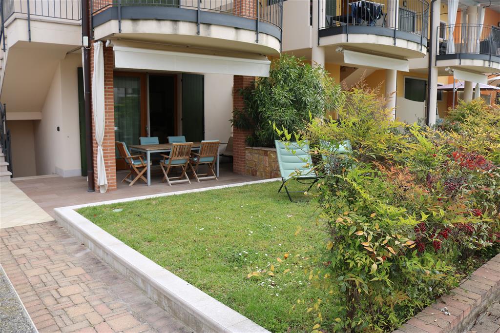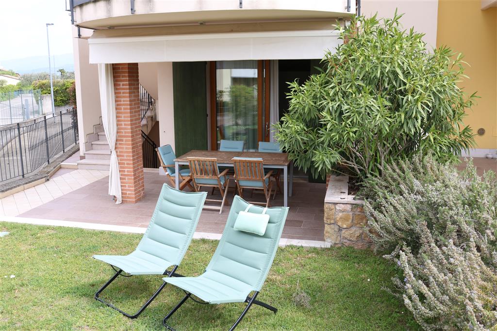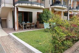 Bellissimo trilocale a pochi passi dal centro storico e dal lago, per 4 persone al piano terra di recente residence molto tranquillo. L'appartamento è composto da soggiorno con angolo cottura, due piccoli giardini, camera matrimoniale, camera con letti a castello e letto estraibile, bagno con doccia e secondo bagno nell'interrato con doccia e lavatrice. Garage con basculante. Arredamento di ottima qualità, lavatrice, frigo grande, forno ventilato, lavastoviglie, aria condizionata, TV satellitare, Wi-Fi. A disposizione: bella piscina in comune con gli altri residenti e garage privato. Animali non ammessi.